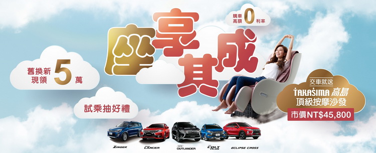 Iscar!中華三菱為提供消費者新年購車最佳好禮,開春之際打出諸試大吉試乘抽十萬購車金活動,並於1月底前購買(需完成交車且領牌) new colt plus、grand lancer、new outlander、zinger、eclipse cross、pajero、outlander phev任一車種即可獲贈「takasima高島頂級按摩沙發」(市價45,800元)。中華三菱試乘好食機! 凡於本月底前 至中華三菱官網預約試乘colt plus、new outlander、grand lancer、zinger、eclipse cross、pajero任一車款,試乘後至活動網站完成登錄即可參加陶板屋優惠券、購車金抽獎活動 全車系 響應政府舊換新,買車現領五萬不用等 colt plus 569萬~629萬 電尾特仕型 中華三菱諸試大吉試乘抽十萬,本月入主指定車型享購車金再加碼! 編輯: 邱志翔 發布於 促銷訊息 1